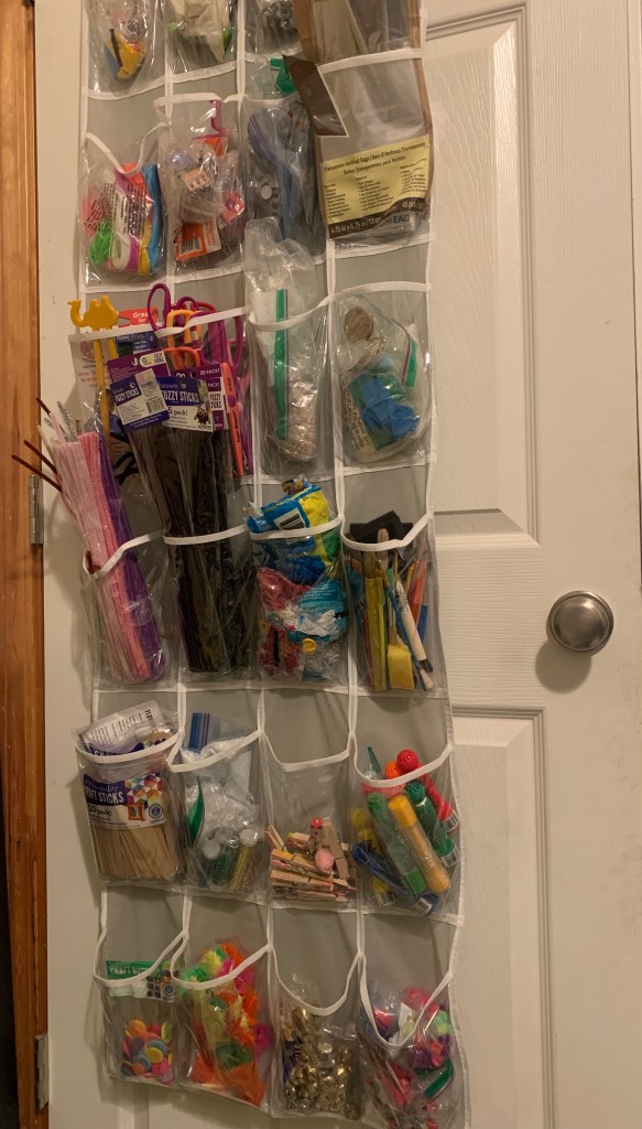 The shoe rack does not hold all my supplies, but it does hold the smallest, easiest to lose ones or the ones I use most often. The pockets are surprisingly big, and I love being able to see what I have in a glance. The accessibility means I am able to do more projects with my kids because I’m not digging through bins to find what I need.