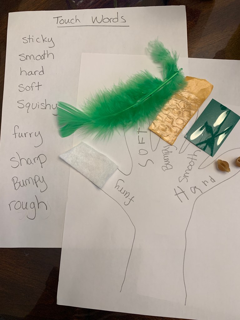 On the last day we explored our sense of touch. I had five items in bags for my son to touch without seeing and describe what he was feeling. We traced his hand and glued the objects on the fingers along with the written describing word. As we talked about things we feel and touch we wrote a list of describing words.