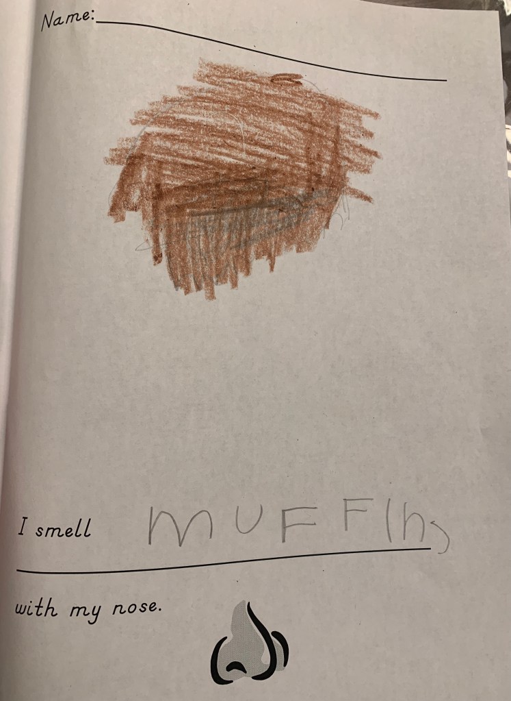 When my 5 year old came down the stairs in the morning, he smelled muffins baking in the oven. It was the perfect intro to the sense of smell! For this lesson I had him blindfolded, and had him smell different spices and items from the kitchen. He smelled vanilla, milk, fish sauce, cinnamon, and several other distinct smells. His favorite? The muffins!
