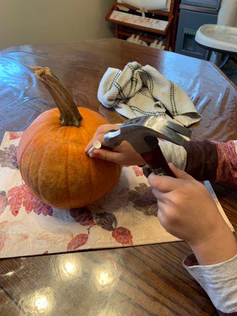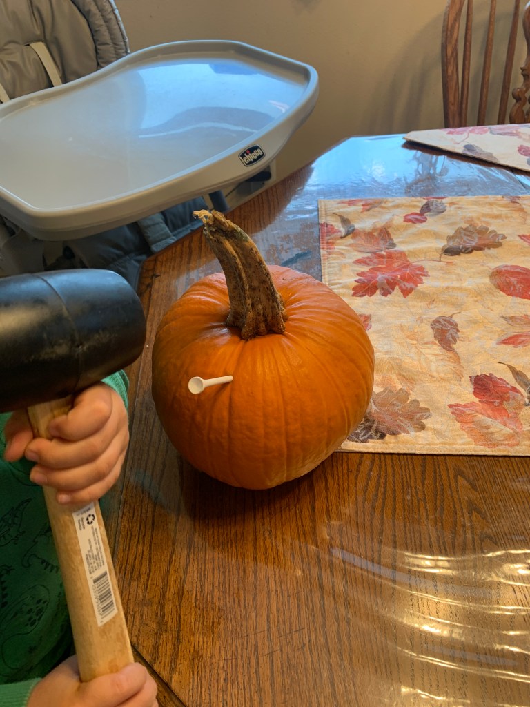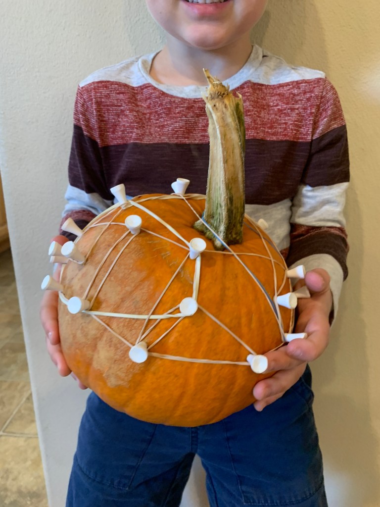 We washed and dried our pumpkins first. I chose small pie-sized pumpkins for this activity, but any size would work. I allowed my kids to hammer their golf tees into any spot on the pumpkin they wanted. Then we stretched rubber bands over the tees, talking about shapes, sides, corners, etc. We practiced making a triangle into a square (or quadrilateral) by stretching the rubber band over another tee.
