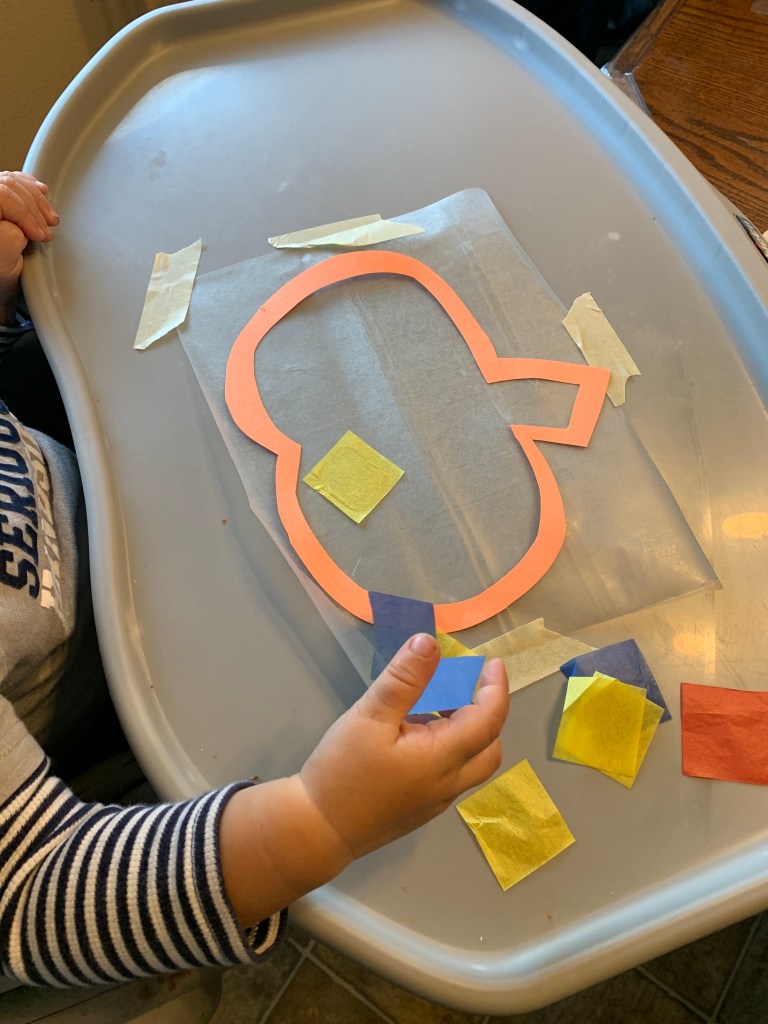 - Lay one piece of contact paper sticky side up on the table. We taped ours down so that it wouldn’t slide around and stick to hands.