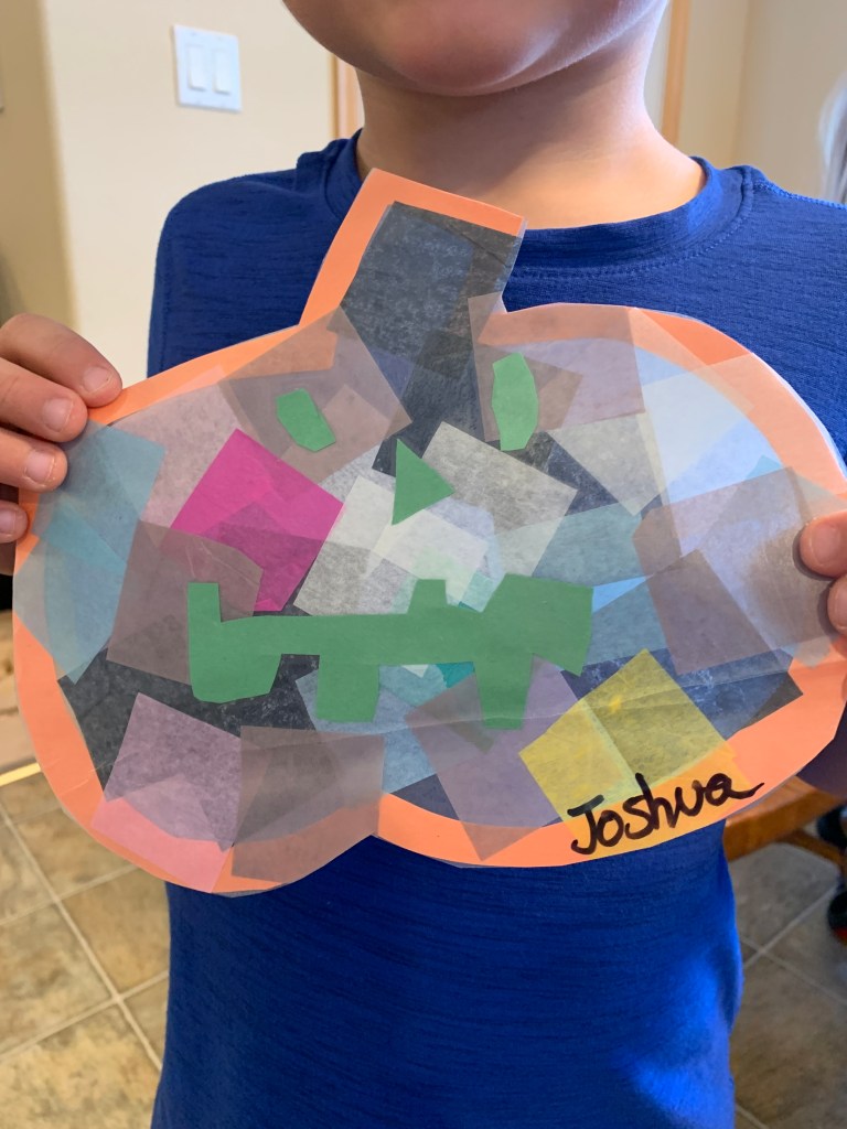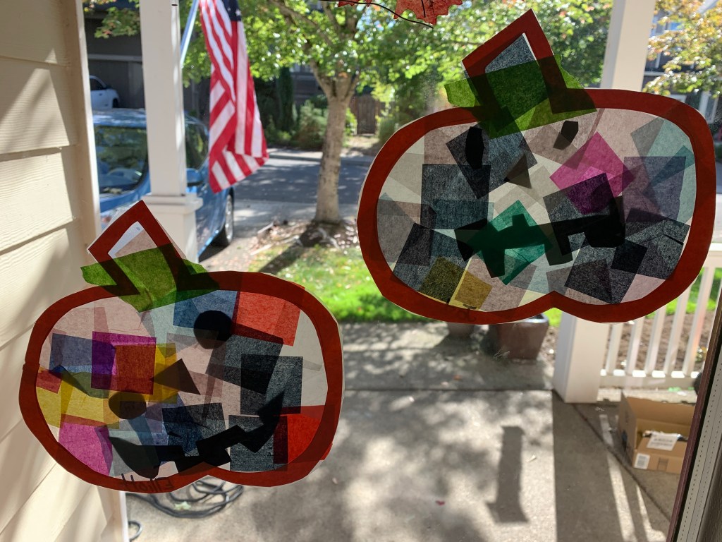 One of my favorite projects for every season is a suncatcher to hang on the window. We have these materials on hand, and have made them in different shapes throughout the year.