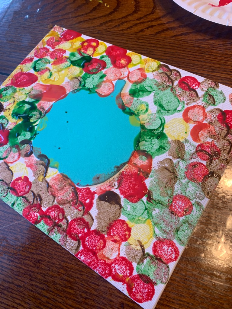 - Dip the pom pom in the paint and dot the canvas all around, making sure to dot the edges of the pumpkin