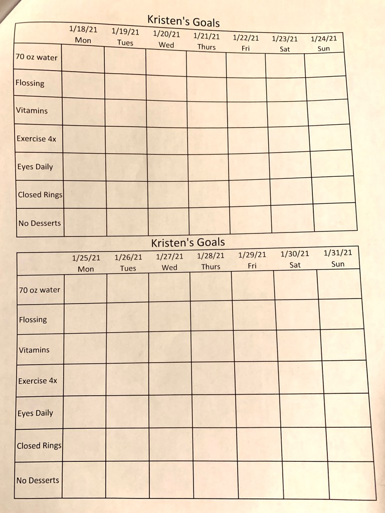 My husband and I each have 7 goals (keeping them equal was important to me, for equal earning opportunities). These are health goals for me, things that are attainable daily but were not always happening as regularly as I wanted. My goals are: