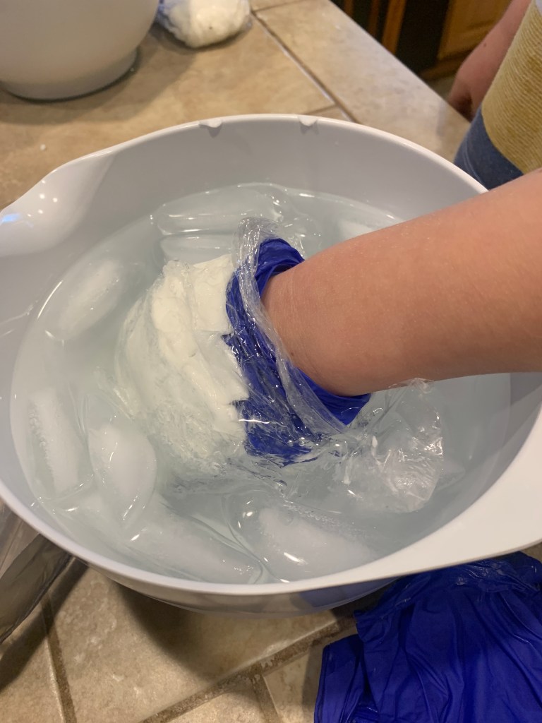 Next, we put shortening all over the gloved hands, wrapping the shortening tight with plastic wrap. The shortening is the “blubber” in our experiment. We predicted that we could keep our hands in longer because the layer of fat would protect us against the icy cold water. My 5 year old kept his hands in the water for 1 minute and 30 seconds this time!