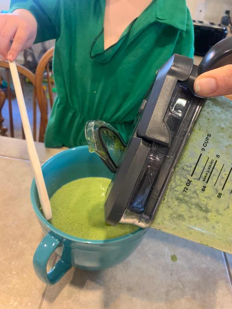 Some of my favorite things to do with holidays is to make the food special. Breakfast is a favorite meal for my kids, so it’s often the best meal to put a little extra thought into. We made pancakes with green food coloring, whipped cream, and green sprinkles for extra fun. A new favorite trick of mine is to blend spinach with the eggs to color them green – my kids love them and I get to sneak some vegetables in! Green milk topped it off for a fun meal.