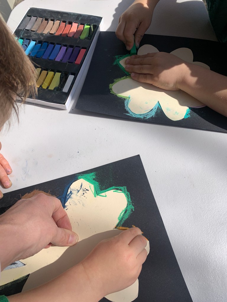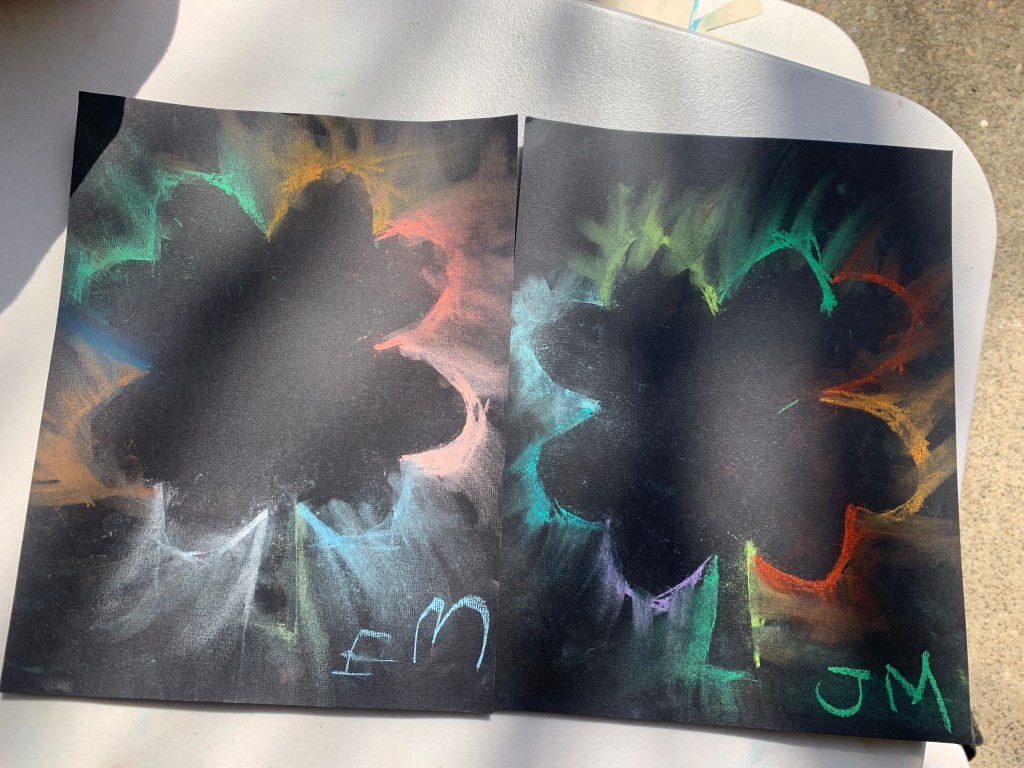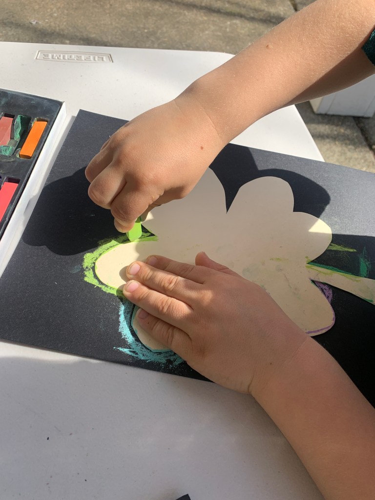 We traced a thick line around the shamrock, then keeping the shamrock in place used our fingers to sweep the chalk out to the edges of the black paper. I love the results!